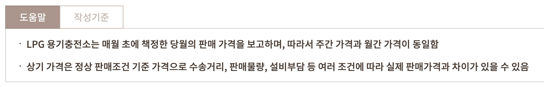 6. 참고로 LPG 가스 가격은 매월 초에 정해진 가격으로 보고되기 때문에 주간 가격과 월간 가격이 같은 게 보통이에요. 다만 수송 거리나 물량, 시설 같은 조건에 따라 실제 판매금액은 조금씩 달라질 수 있습니다.