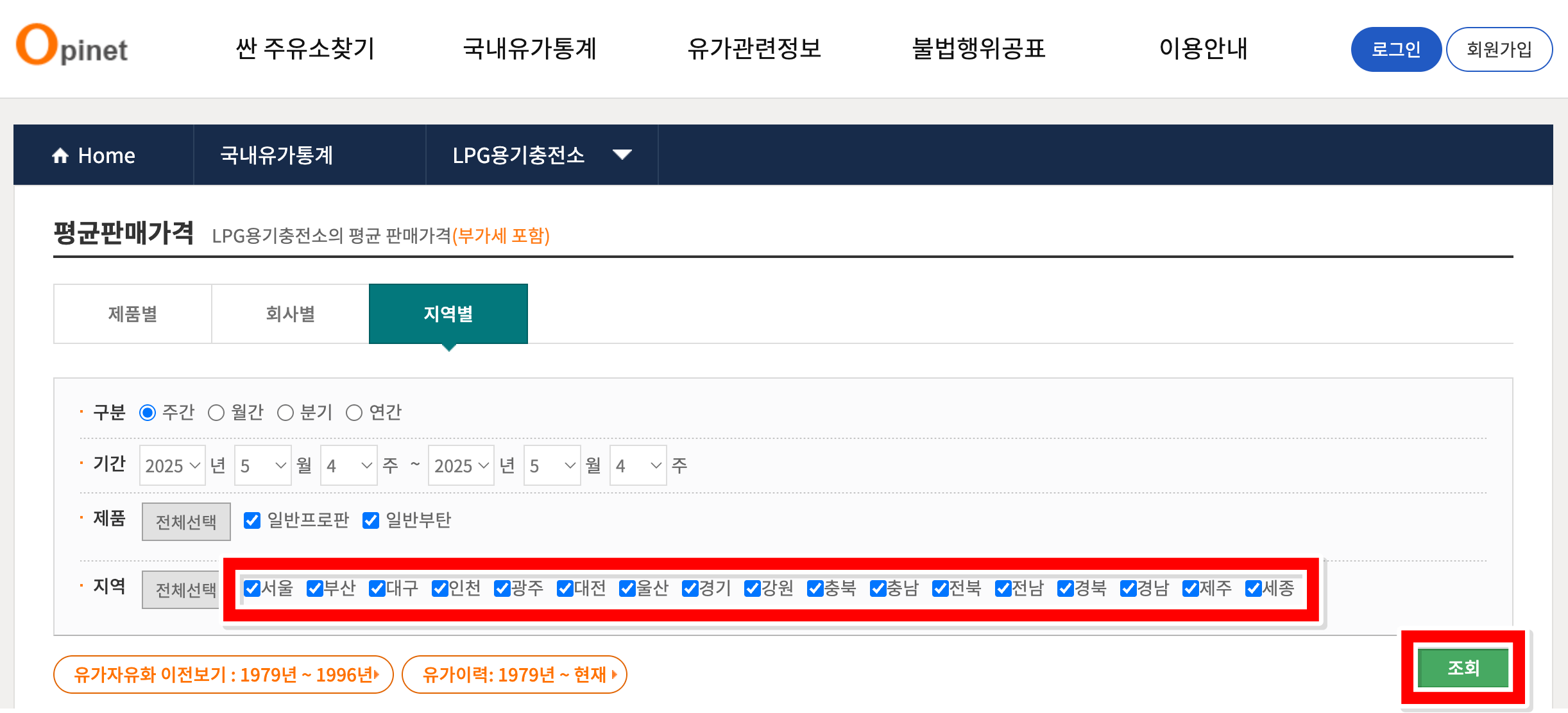 4. 처음에는 전국 모든 지역이 자동으로 선택되어 있는 상태입니다. 여기서 내가 거주하는 지역만 고른 다음 오른쪽에 있는 조회 버튼을 눌러주면 해당 지역의 LPG 가격만 따로 볼 수 있어 확인이 간편해요.