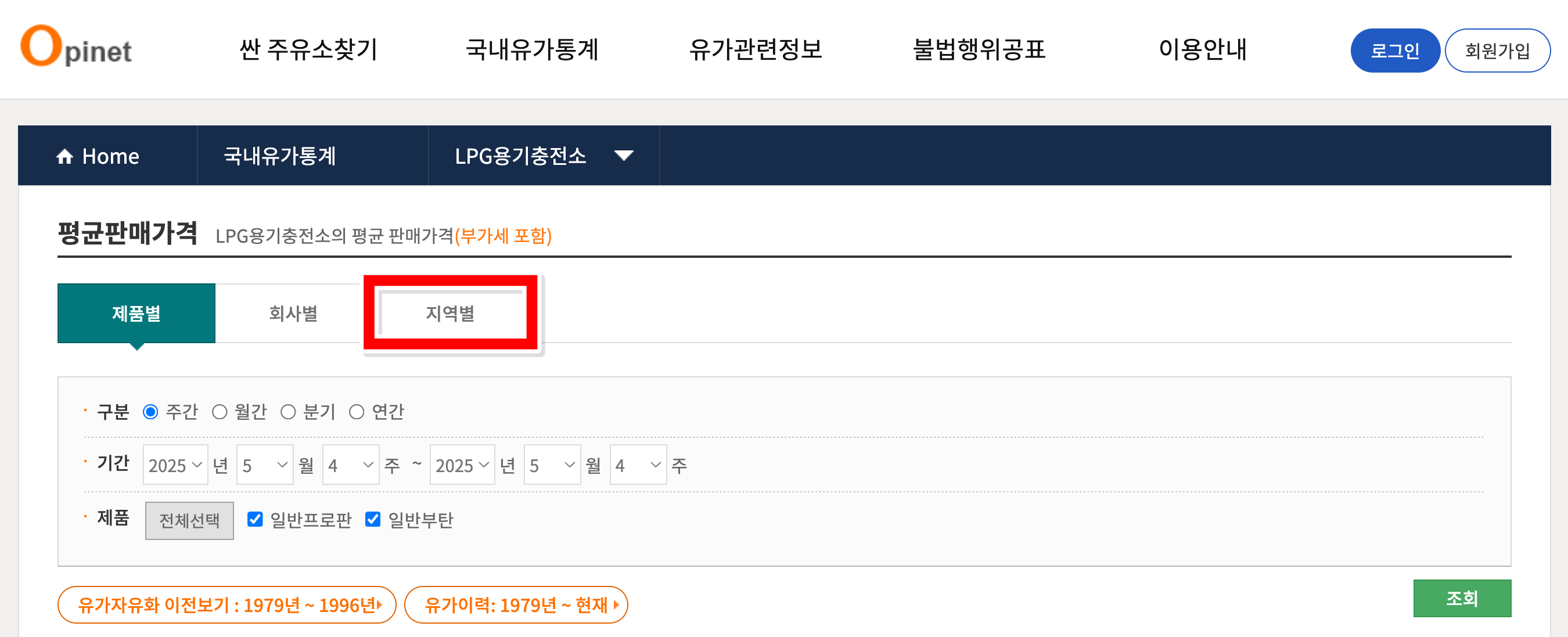 3. 메뉴 안으로 들어가면 LPG 평균 판매가격을 볼 수 있는 화면이 나타납니다. 여기서 지역별 메뉴를 선택하면 내가 살고 있는 동네의 가격만 따로 확인할 수 있어 비교할 때 정말 유용합니다.