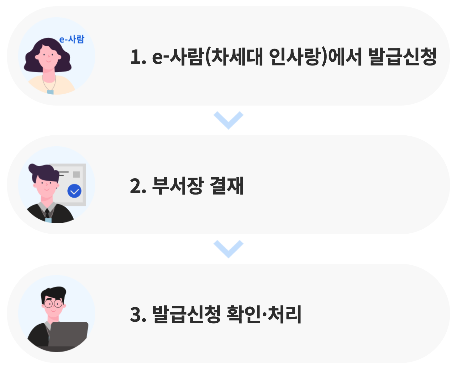 3. 발급 신청을 확인한 후에는 부서장의 결재가 처리됩니다. 결재가 완료되면 발급 절차가 순차적으로 진행되며, 이후 단계에 대한 안내도 따로 받을 수 있습니다.