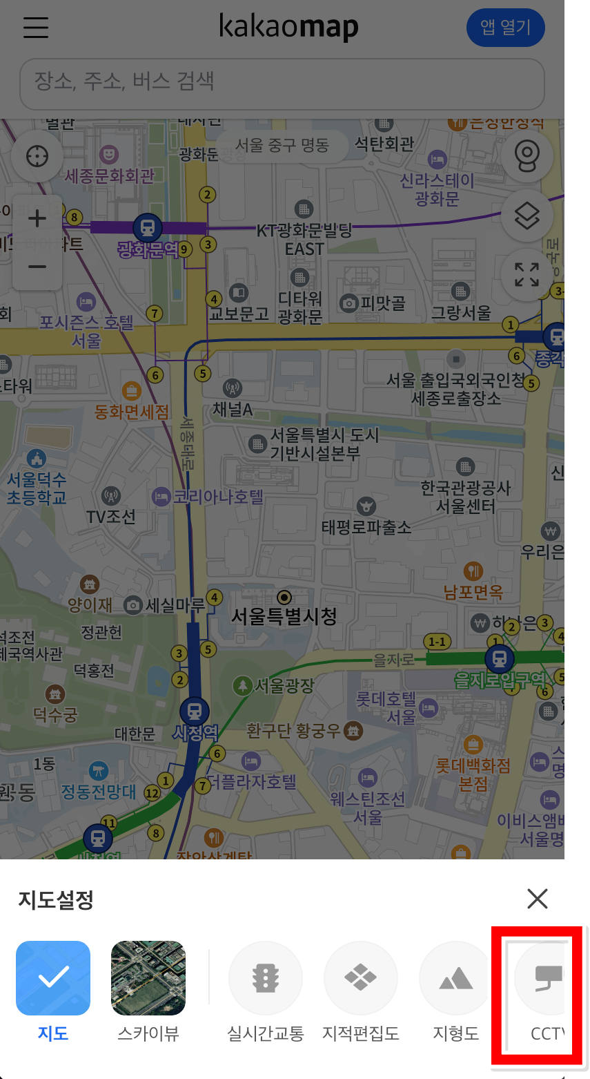 2. 화면 아래쪽에 지도설정 메뉴가 열리면 오른쪽에 CCTV를 선택해주세요.