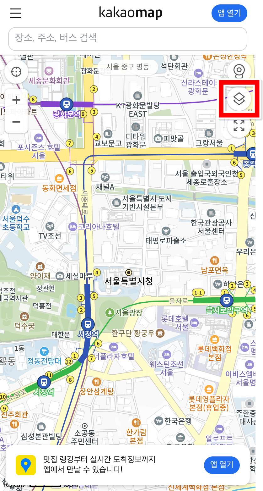 1. 카카오맵으로 접속합니다. 카카오맵 앱을 사용하시는 분들은 앱을 실행하셔서 보시면 더욱 편해요. 앱을 굳이 설치하지 않아도 웹페이지로도 가능해요. 지도 화면 오른쪽에 떠있는 메뉴 중에서 두번째 메뉴를 선택하세요.