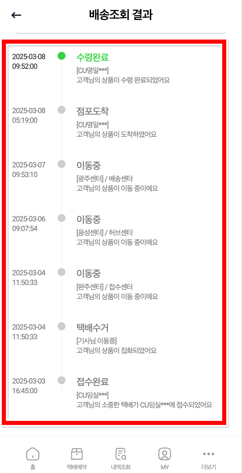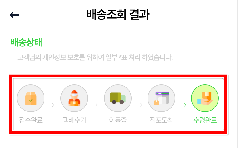 5. 접수 일시부터 현재 위치까지 단계별로 확인할 수 있어 어디쯤 도착했는지 알 수 있습니다. 배송이 완료된 경우에는 정확한 날짜와 시간까지 나와서 확인이 간편합니다.