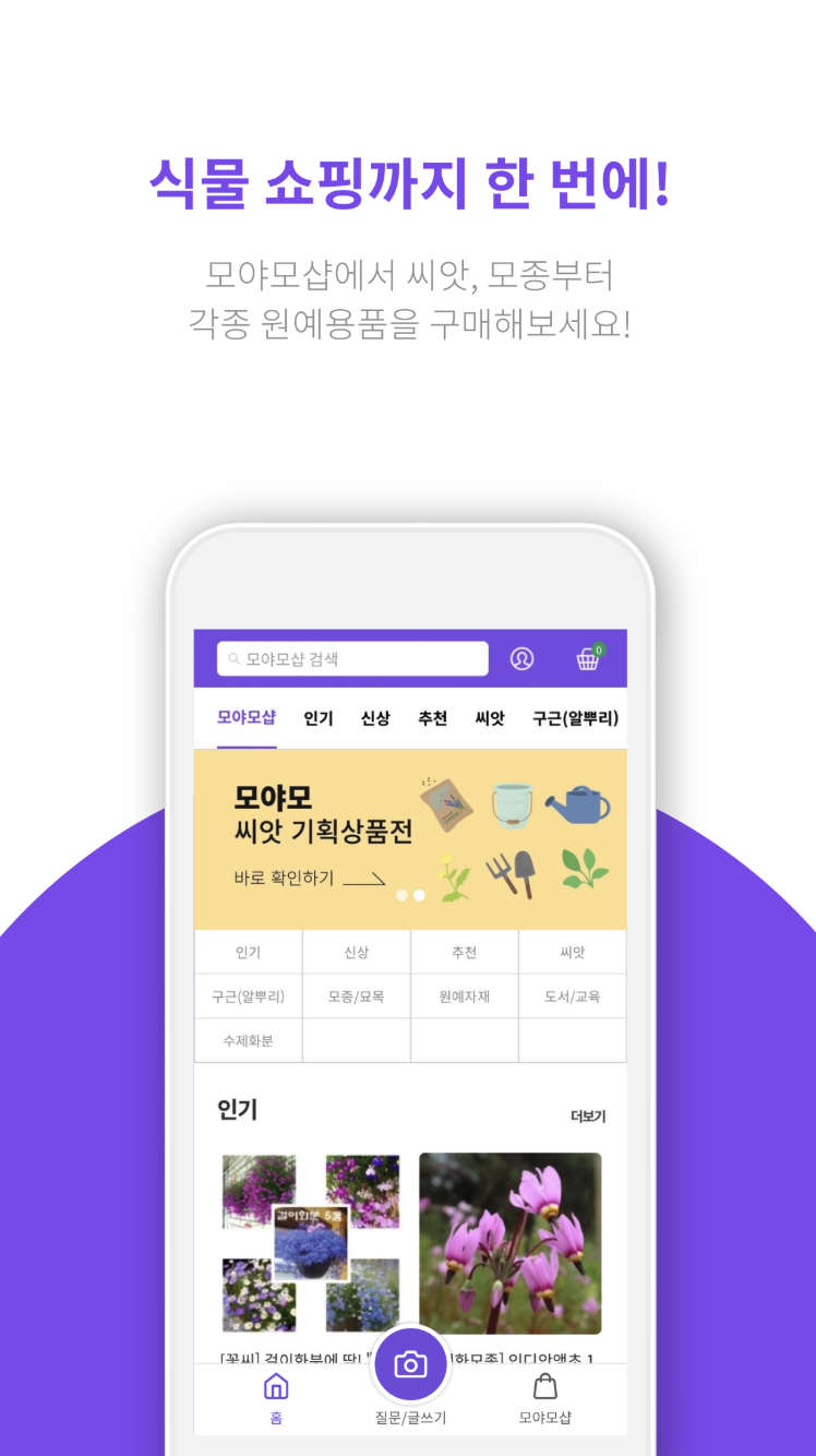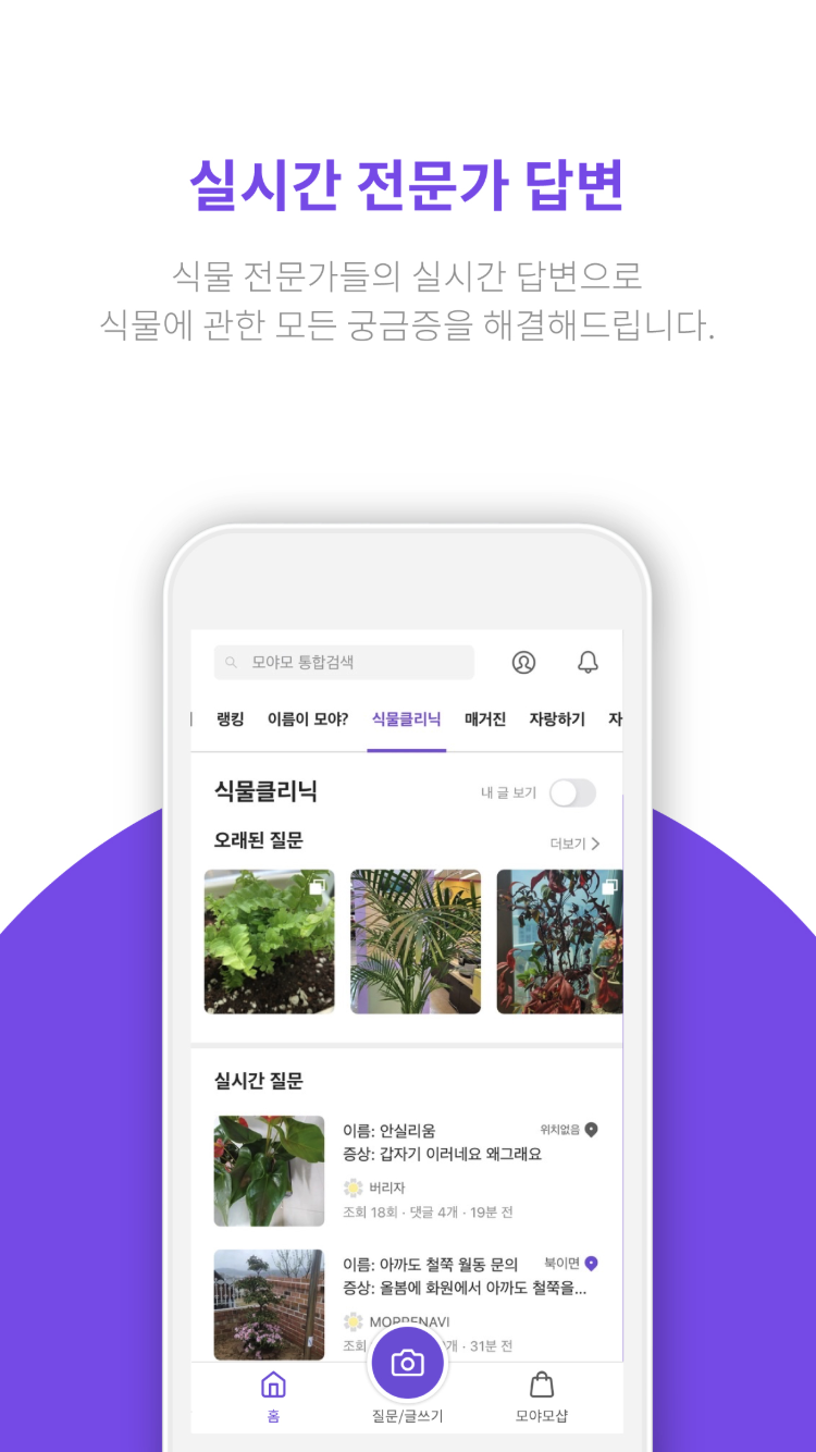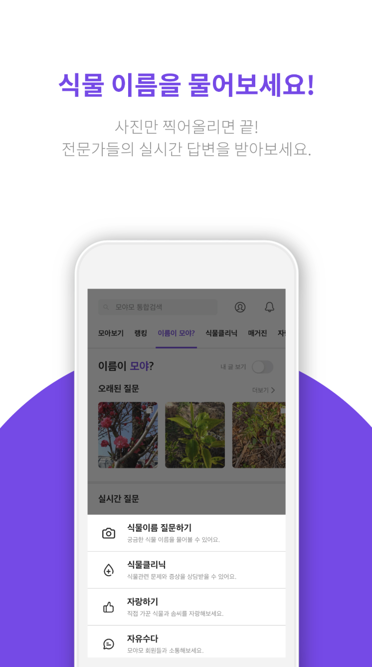 1. 궁금한 식물 사진을 올리면 이름을 알려주는 기능이 있어서 누구나 쉽게 식물 이름을 알아볼 수 있어요. 전문가들의 실시간 답변도 받을 수 있어요.