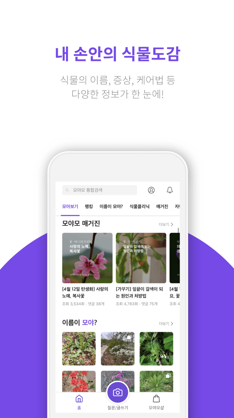 사진만 찍어서 올리면 국내 식물 전문가와 140만 사용자들이 실시간으로 답을 알려주는 참여형 커뮤니티 서비스입니다. 식물뿐 아니라 병충해 진단, 꽃말 안내, 관련 이야기까지 공유할 수 있어 자연에 대한 이해를 넓히기에 안성맞춤입니다. 식물이름 찾기 무료 어플 모야모에서 알아볼 수 있습니다.