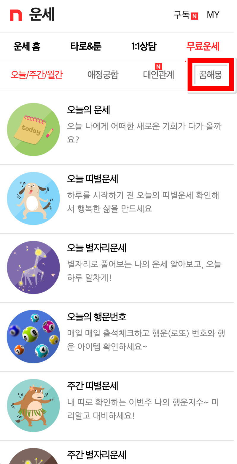 2. 무료운세 메뉴 중에서 '꿈해몽'을 고르면 오늘의 운세, 띠별운세, 별자리운세처럼 다양한 콘텐츠 목록이 함께 보여요. 꿈해몽도 이 메뉴에서 손쉽게 찾을 수 있어요.