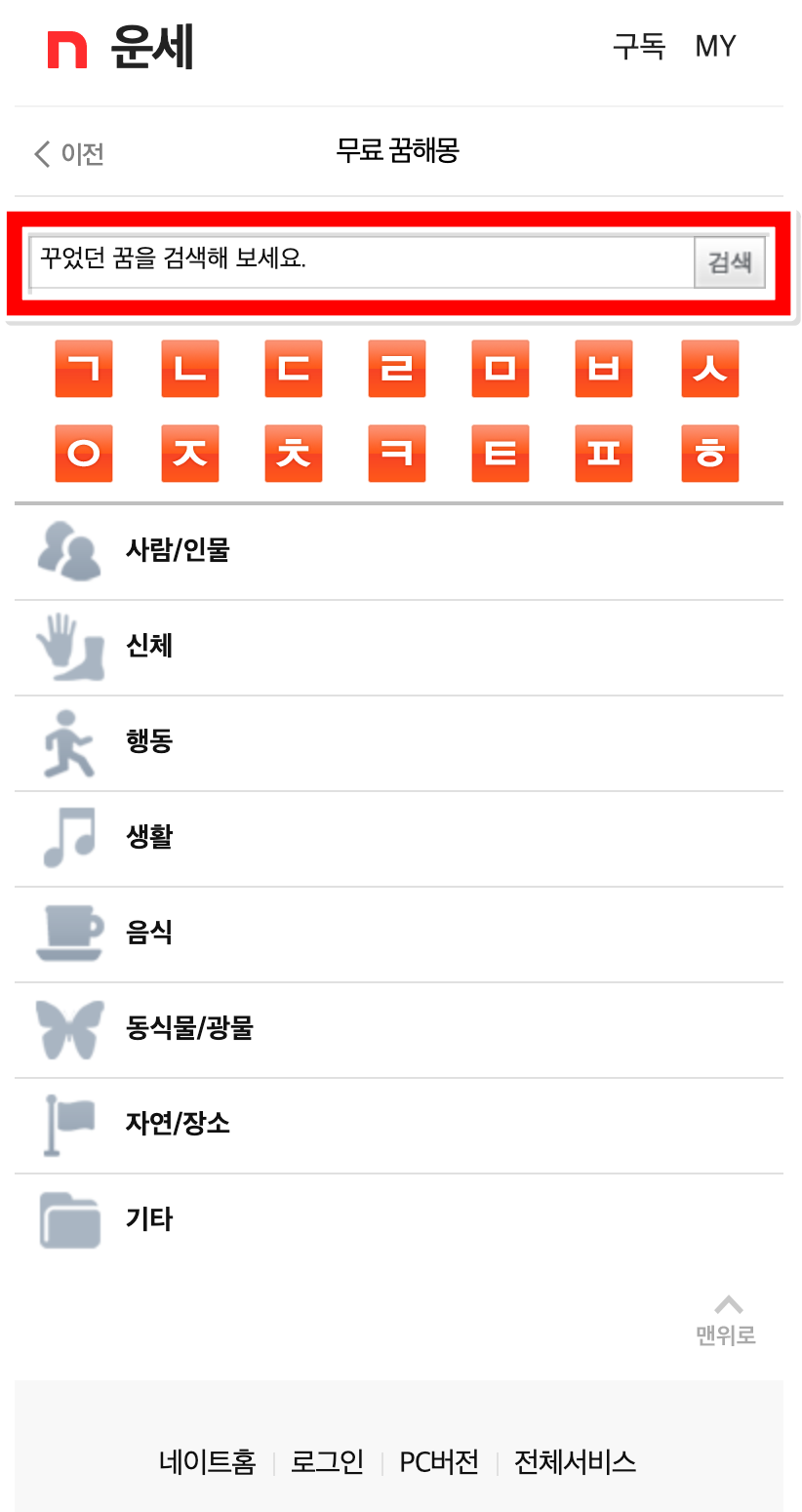 4. 검색창에 꿈 내용을 입력하거나 자음 버튼이나 카테고리를 이용해 관련 키워드를 쉽게 찾을 수 있어요. 사람, 동물, 장소 등 다양한 주제로 정리돼 있어요.