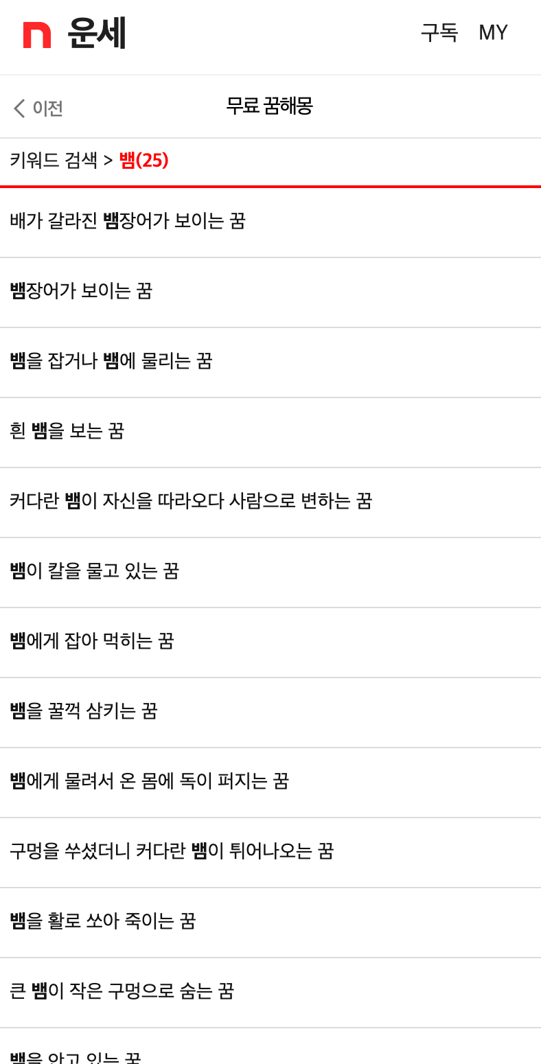 5. 예를 들어 '뱀'을 검색하면 뱀과 관련된 해몽 결과들이 한눈에 정리돼 있어서 꿈 내용을 구체적으로 확인할 수 있어요. 상황별로 세세하게 나뉘어 있어요.