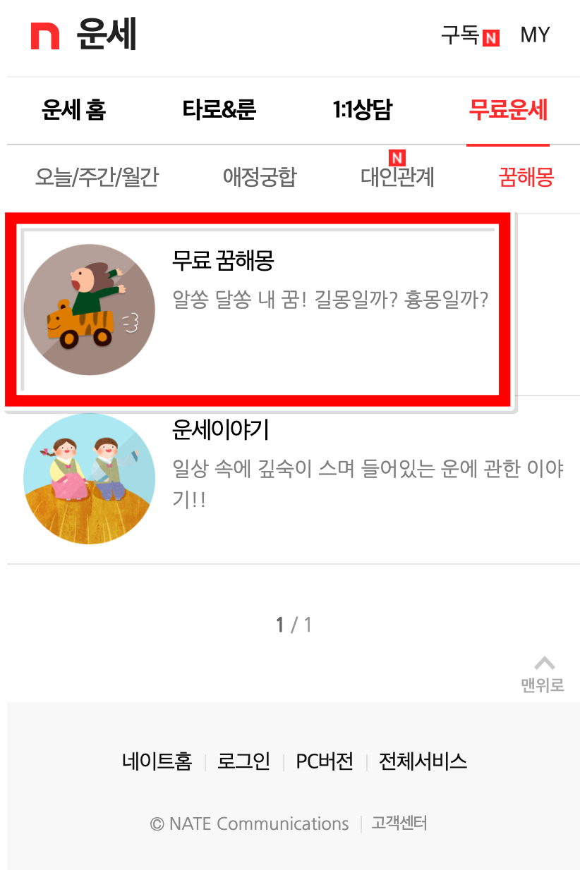 1. 네이트 운세 메뉴에서 '무료운세' 항목으로 들어가면 다양한 주제별 운세 서비스를 선택할 수 있어요. 이름풀이나 사주 외에도 꿈과 관련된 항목도 있어요.