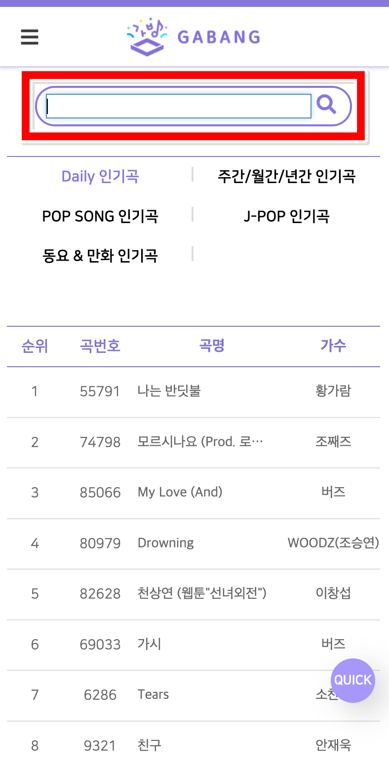 3. 검색창에 가수명이나 곡명을 입력하면 원하는 노래를 바로 찾아볼 수 있고 순위 곡번호 곡명 가수 정보가 표로 정리돼서 보여요.