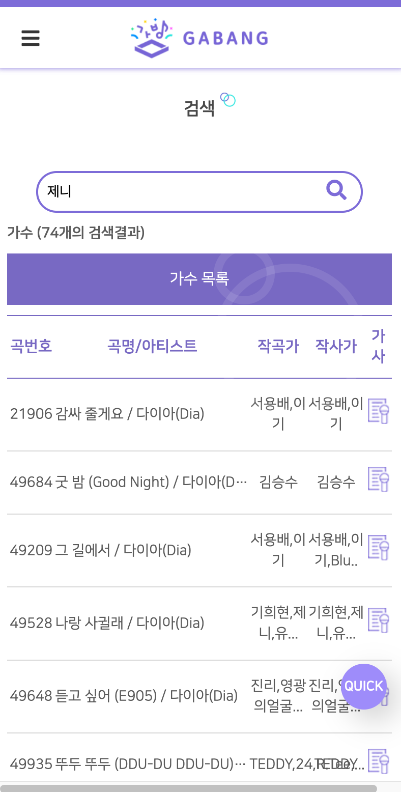 4. 검색 결과에서 곡 번호를 바로 확인하실 수 있고, 오른쪽에 가사 아이콘을 눌러 가사까지 확인할 수 있어요.