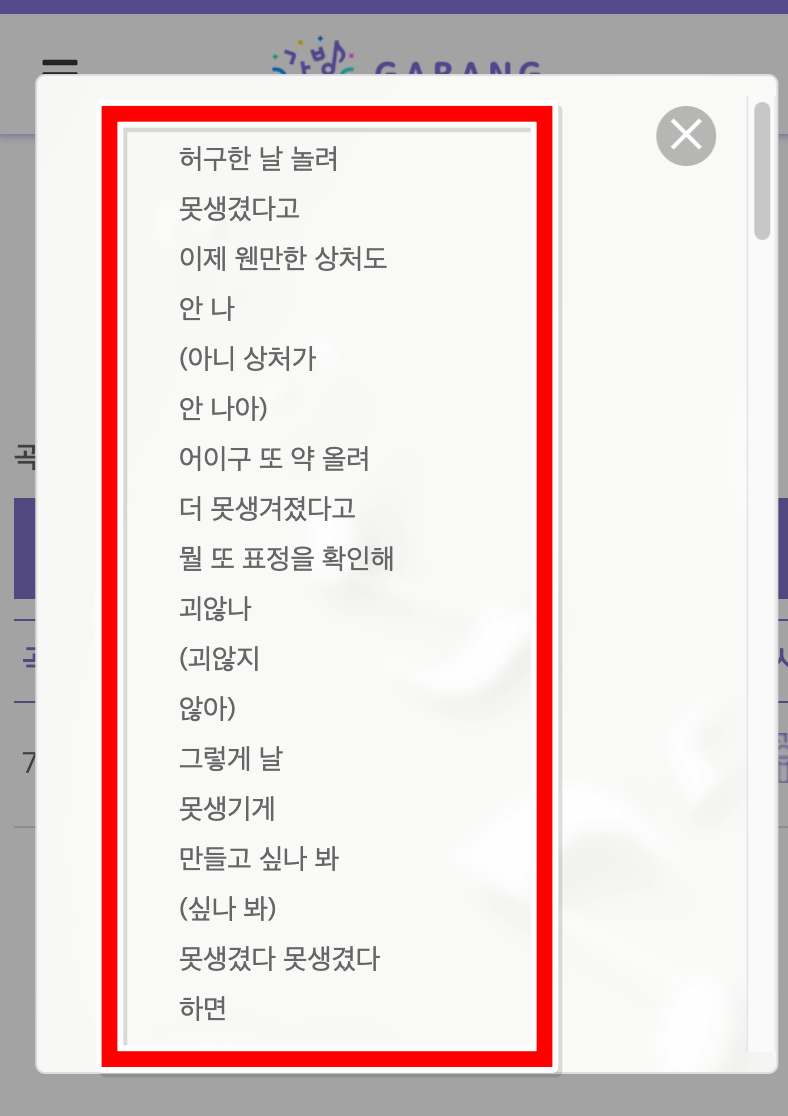 5. 해당 곡의 전체 가사를 볼 수 있어 편해요. 가사는 깔끔하게 줄 단위로 정리돼서 바로 따라 부르기 쉬워요.