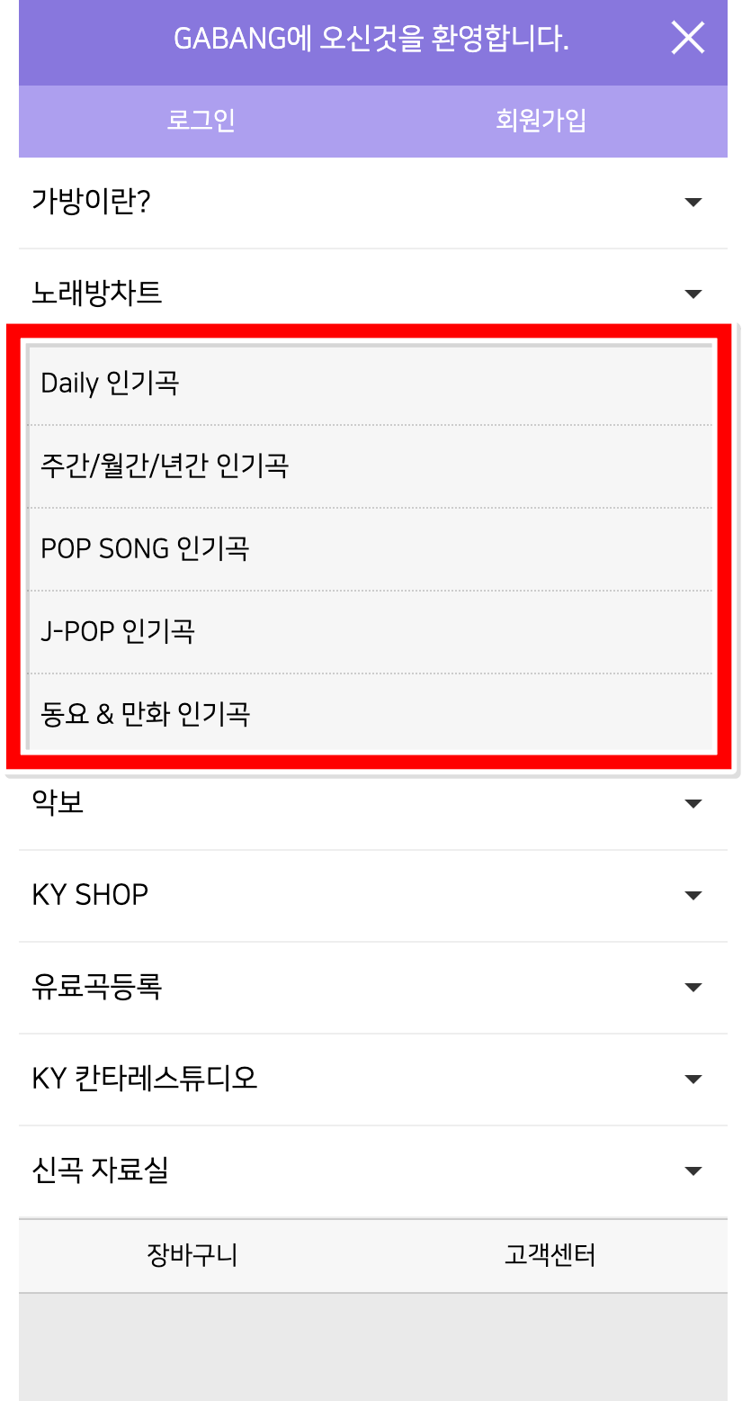 2. 메뉴 항목 중 '노래방차트'를 누르면 인기곡을 일별 주간 월간 연간 단위로 확인할 수 있고, 아무 차트나 들어가셔도 노래 검색을 할 수 있어요.