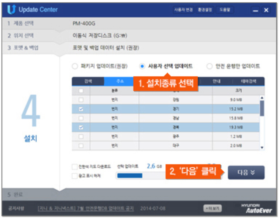 7. 업데이트 종류를 선택하여 주시는데 패키지 업데이트, 사용자 선택 업데이트, 안전 운행만 업데이트 중에 원하시는 종류로 선택하세요.