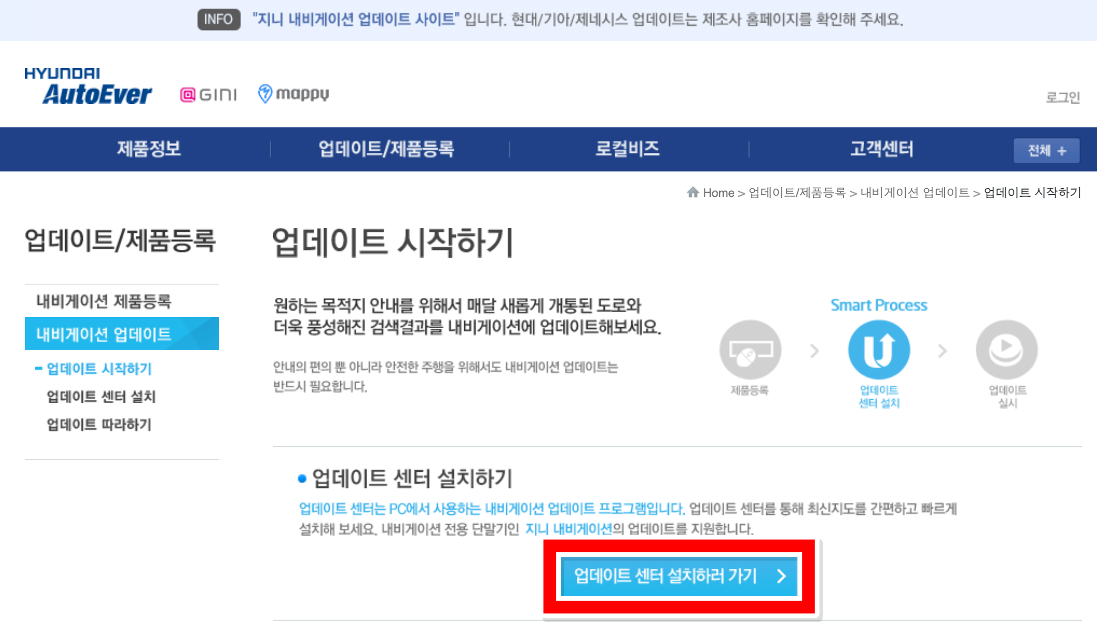 1. 현대 오토에버 네비게이션 업데이트 사이트로 들어가셔서 업데이트 메뉴로 들어가세요.