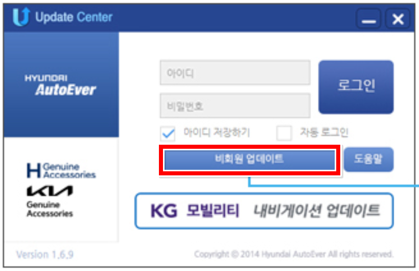3. 현대오토에버 아이디와 비밀번호를 입력 해주세요. 회원가입이 안되어 있어도 비회원 업데이트로 진행하시면 이용하실 수 있어요.