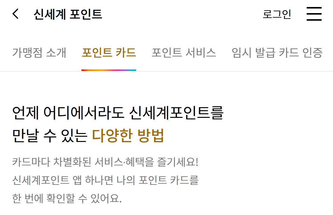 3. 이 페이지에서는 신세계포인트를 쓸 수 있는 여러 방법이 소개돼요. 다양한 카드가 한눈에 보여서 어떤 방식이 내게 맞는지 살펴보기도 좋아요.