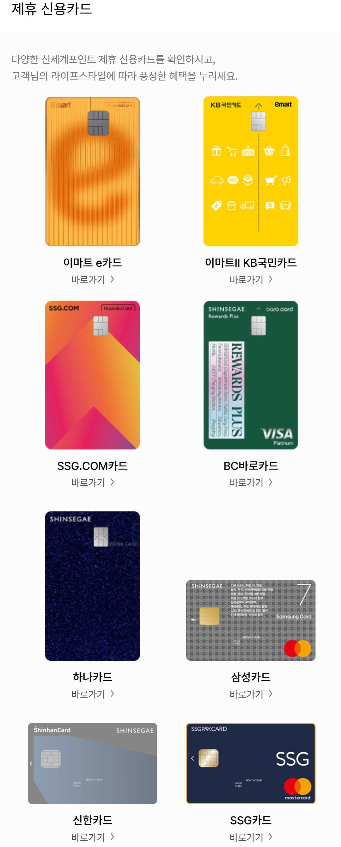 7. 신세계 계열과 연계된 다양한 신용카드들도 있어요. 각각의 카드마다 특징이 달라서 평소 생활패턴에 맞는 걸 고르면 좋아요.