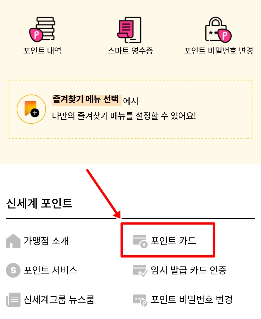 2. 전체 메뉴에서 '포인트 카드' 항목을 눌러 들어가면 신세계포인트 관련 메뉴가 나와요. 포인트 카드 등록이나 관리가 이곳에서 가능해요.