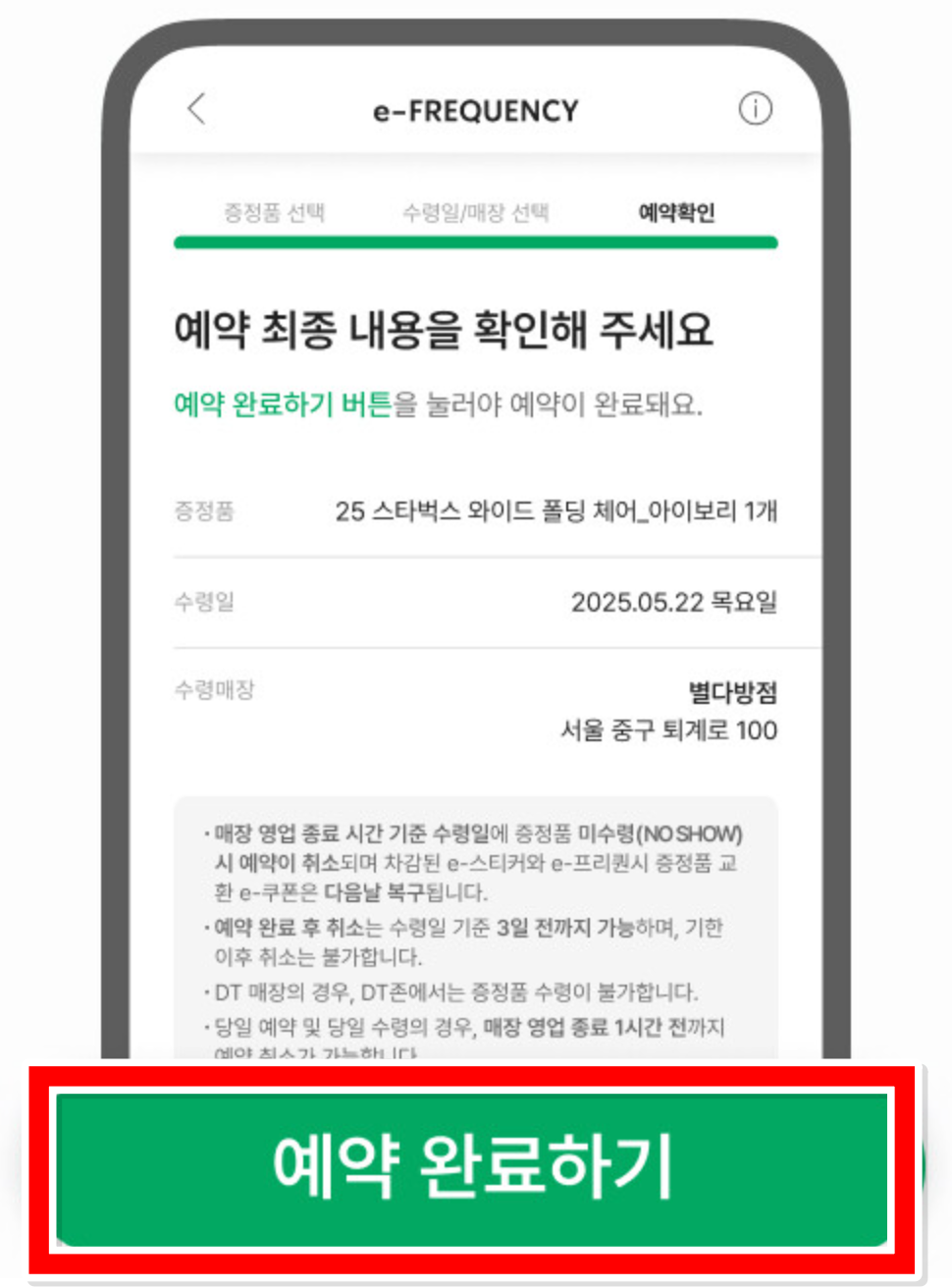 7. 마지막으로 예약 정보를 최종 확인 해주시고, 예약 완료하기 버튼을 눌러주세요. 예약 완료하기 버튼을 누르지 않으면 예약이 완료되지 않기 때문에 반드시 예약 완료하기 눌러주세요~!