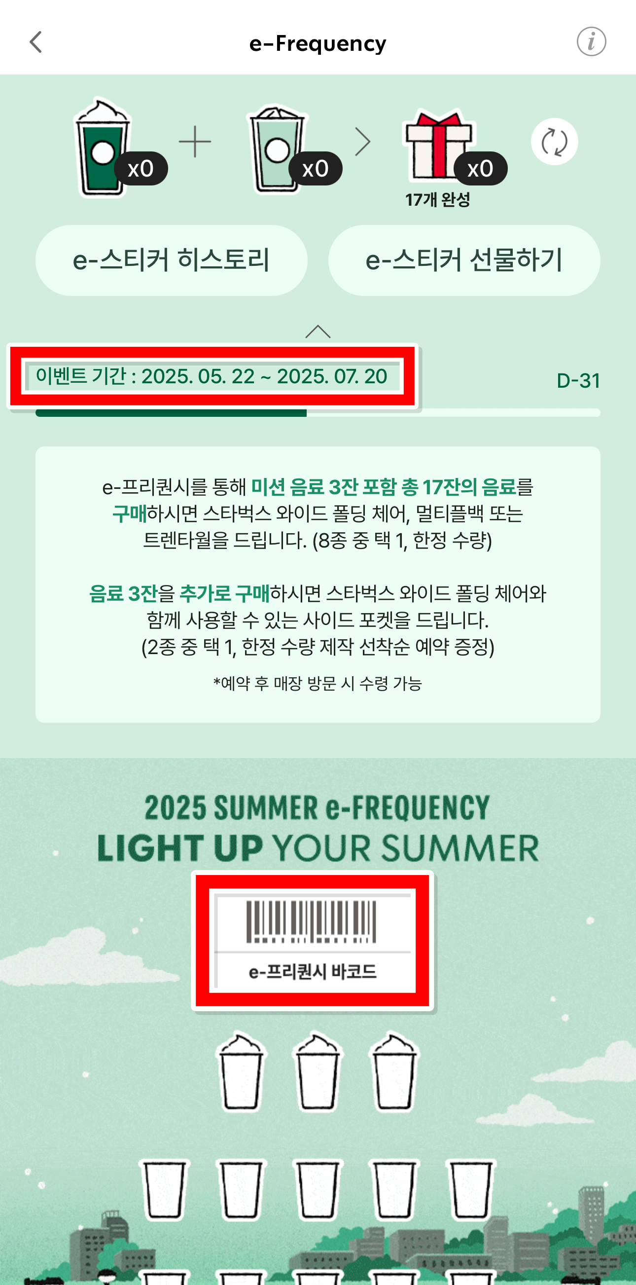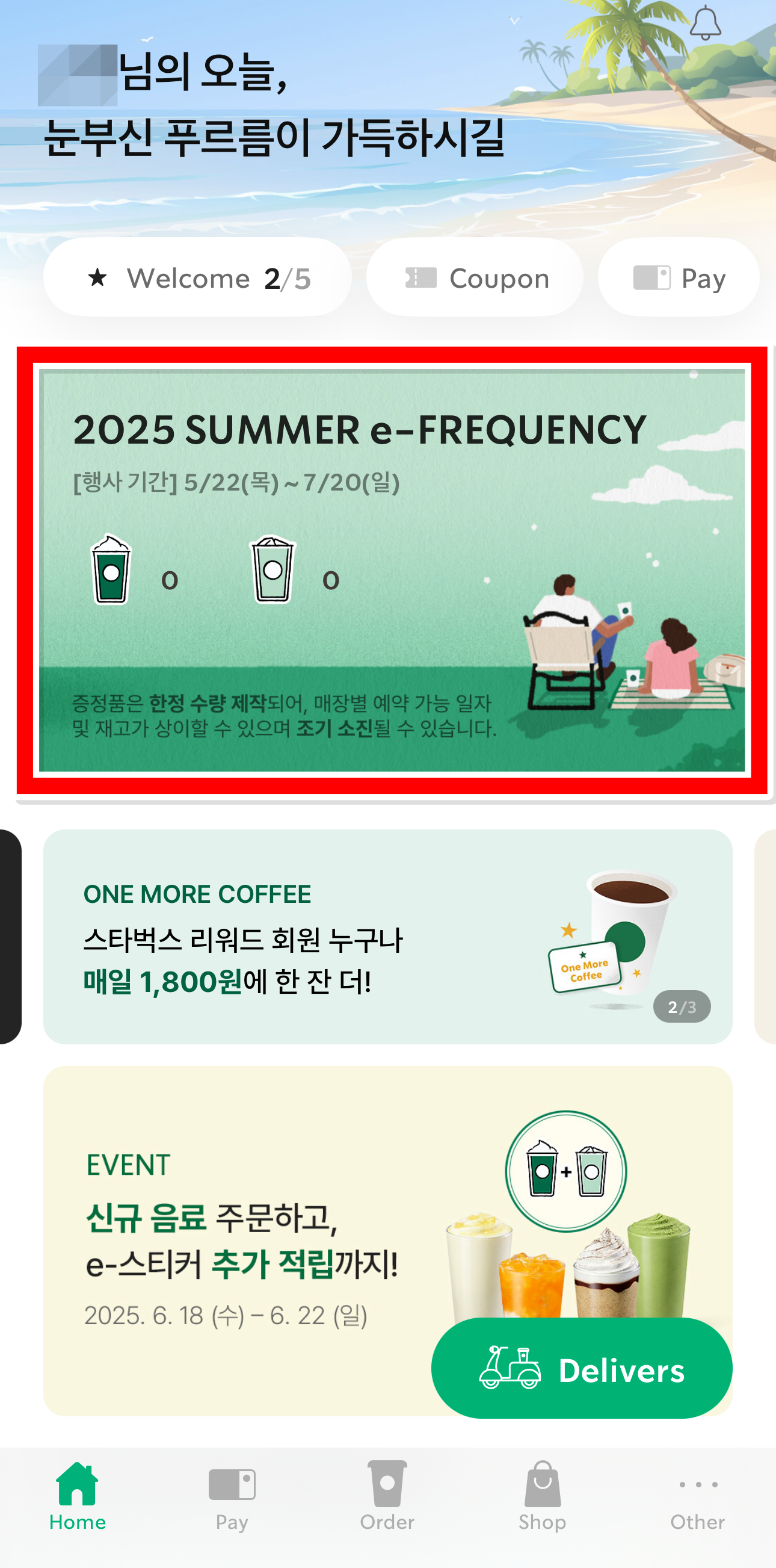 1. 스타벅스 앱을 실행하시고 로그인한 상태에서 2025 SUMMER e-FREQUENCY 배너로 들어가세요.