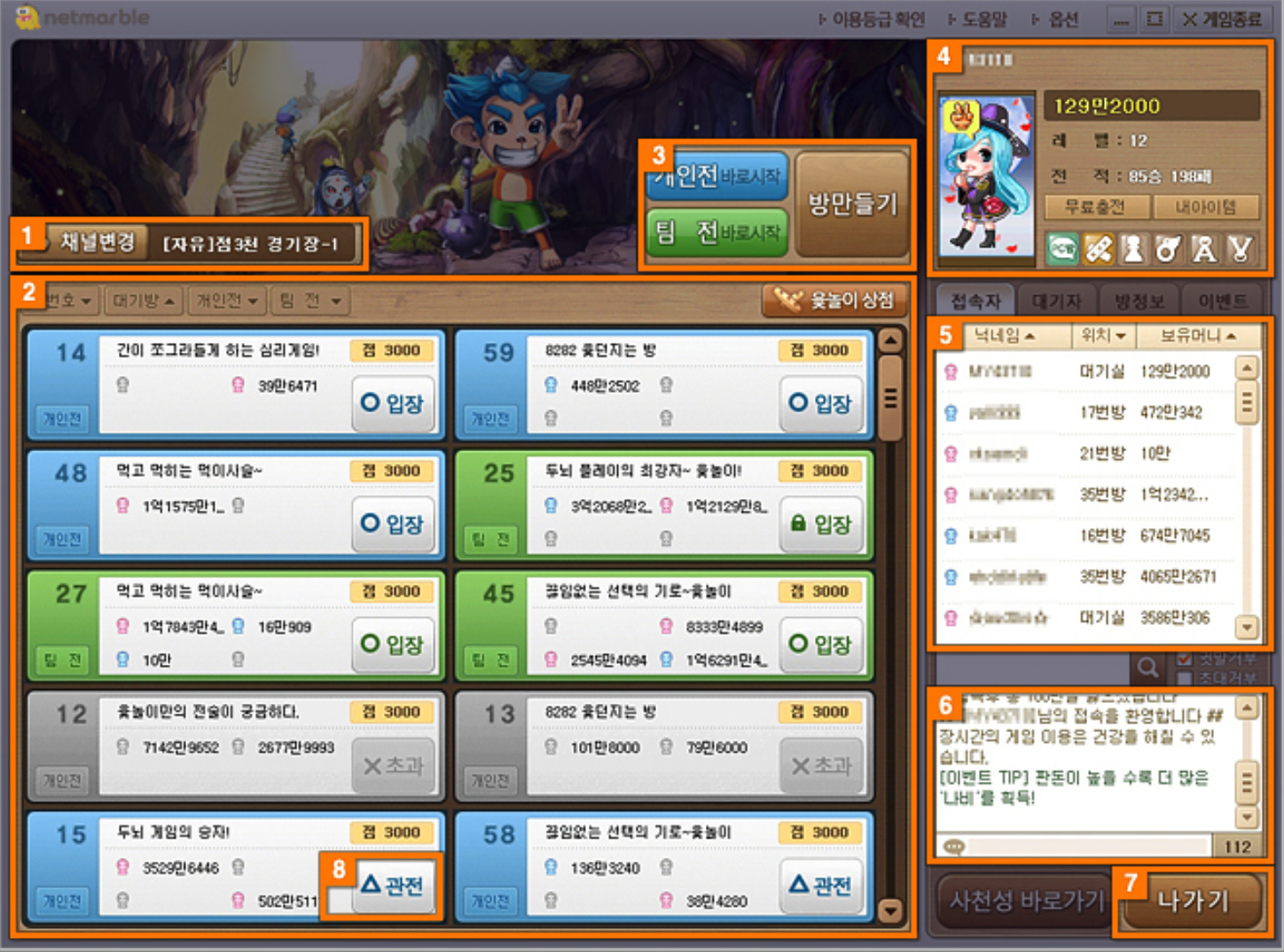 5. 경기장 내부에서는 채널 변경, 대기방 확인, 팀전과 개인전 전환, 캐릭터 정보와 보유머니 확인 등 다양한 기능을 한 화면에서 조작할 수 있게 구성돼 있어요.