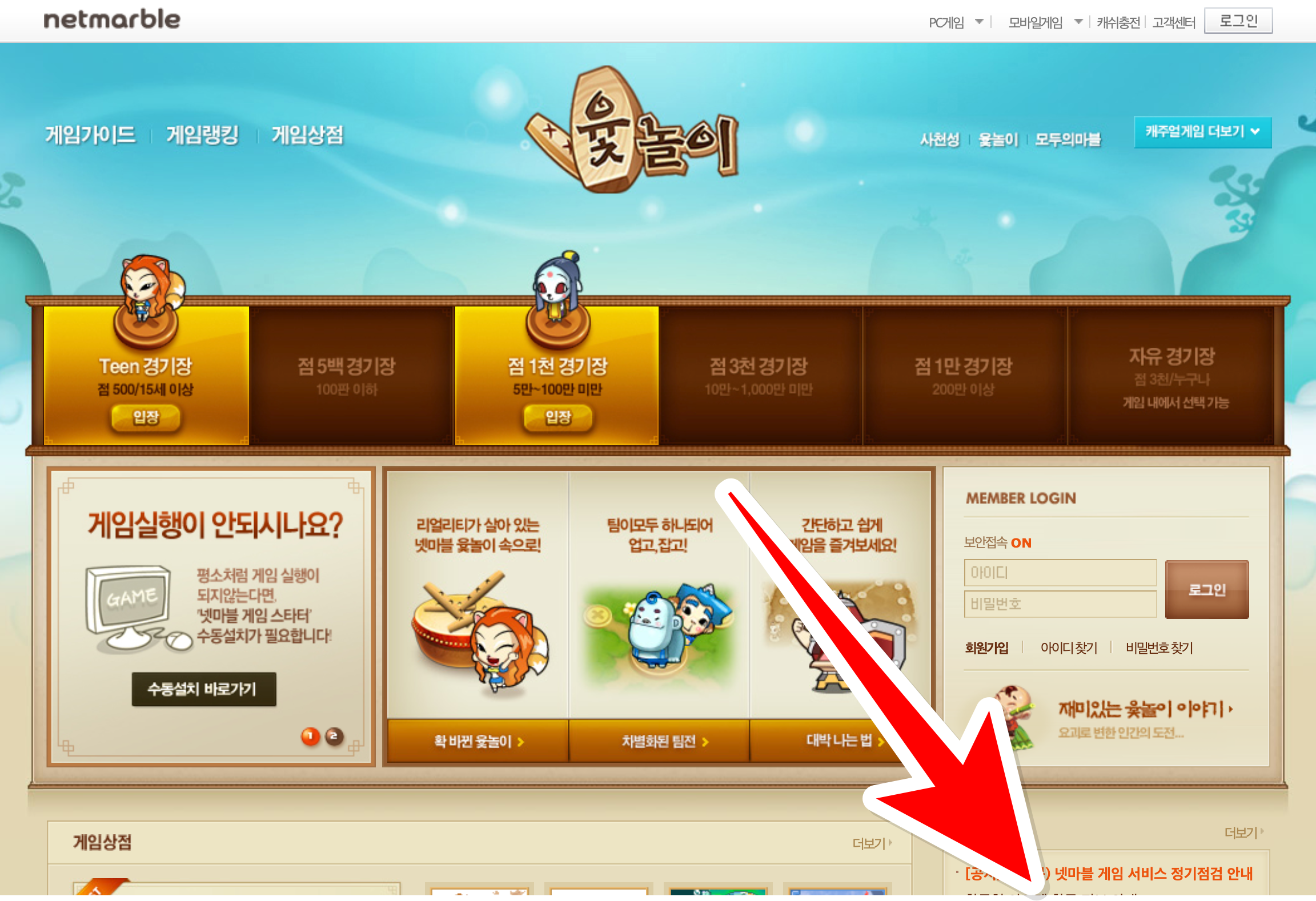 1. 넷마블 윷놀이 메인화면에서는 다양한 경기장 입장을 고를 수 있고, 게임을 실행하시려면 메인화면 오른쪽 하단에 다운로드를 받아 프로그램을 설치하셔야해요.