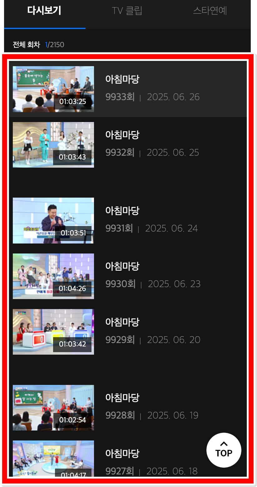 4. 하단으로 스크롤을 내려보시면 전체회차가 최근 순서대로 보여집니다. 날짜나 회차를 잘 보시고 놓친 방송일자나 회차를 선택하시면 바로 시청이 가능하세요.