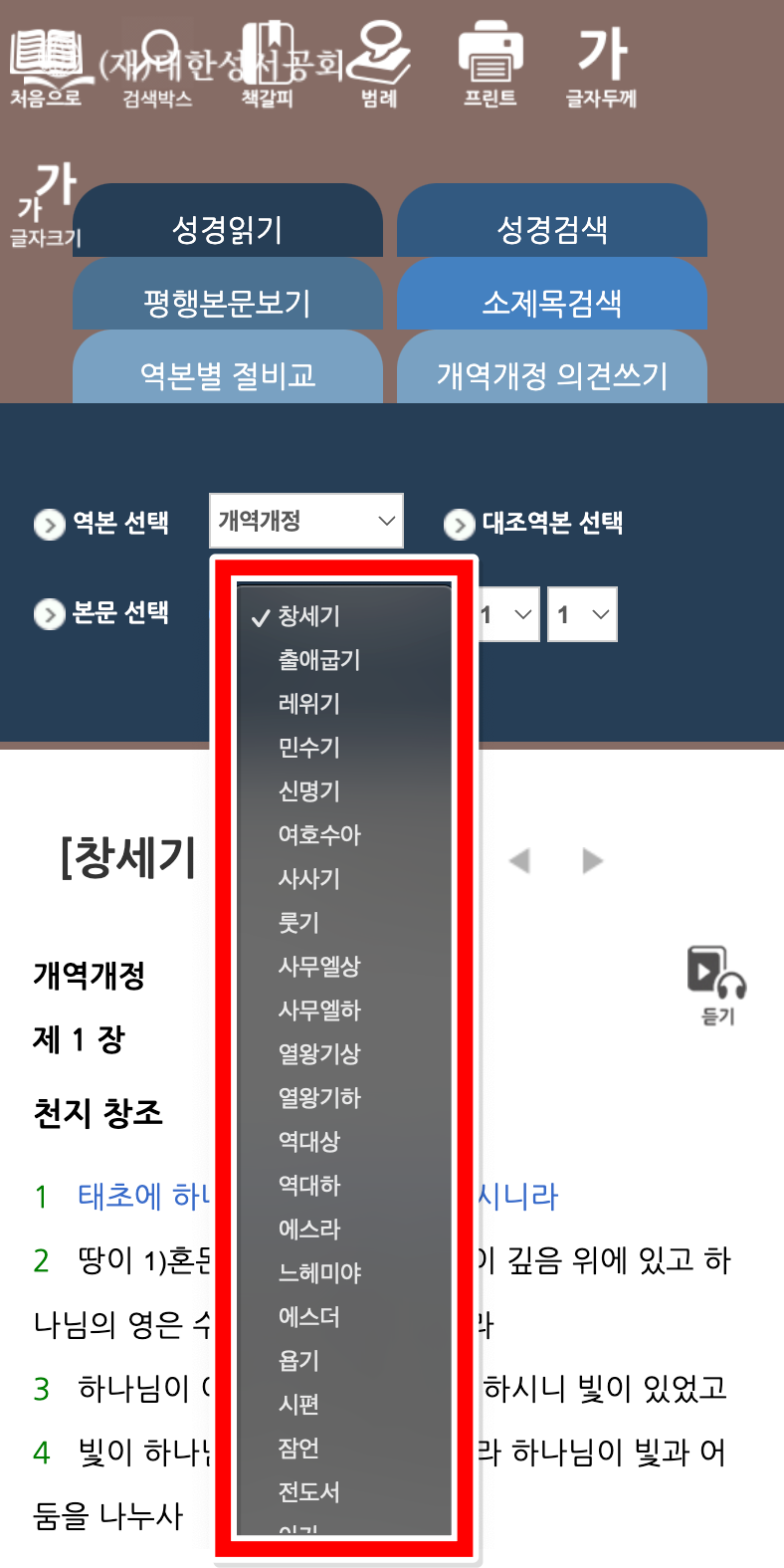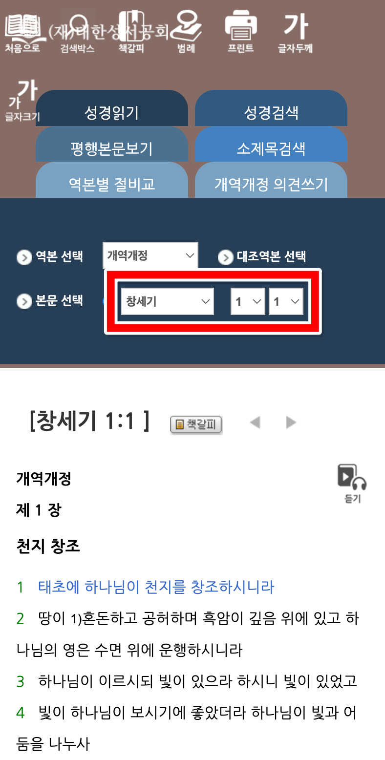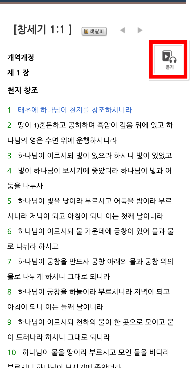 4. 본문 상단에 ‘듣기’ 메뉴를 선택하시면 음성으로 라디오처럼 성경을 청취할 수 있어요.