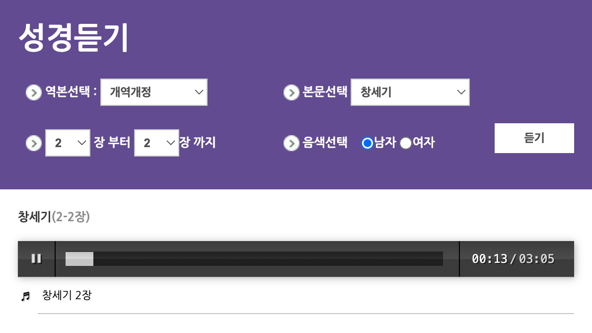 5. 성경듣기 창이 뜨면서 본문 장 선택, 절선택 모두 가능하시고 읽고 싶은 성경 범위와 목소리 종류(남/여)를 정한 뒤 재생 버튼을 눌러 성경읽기를 라디오처럼 청취해보세요.