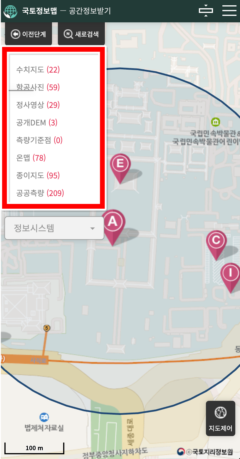 6. 검색된 위치에서 수치지도, 항공사진, 영상, 종이지도 등 자료 종류별로 얼마나 있는지도 확인할 수 있어서 원하는 형태로 골라볼 수 있어요.