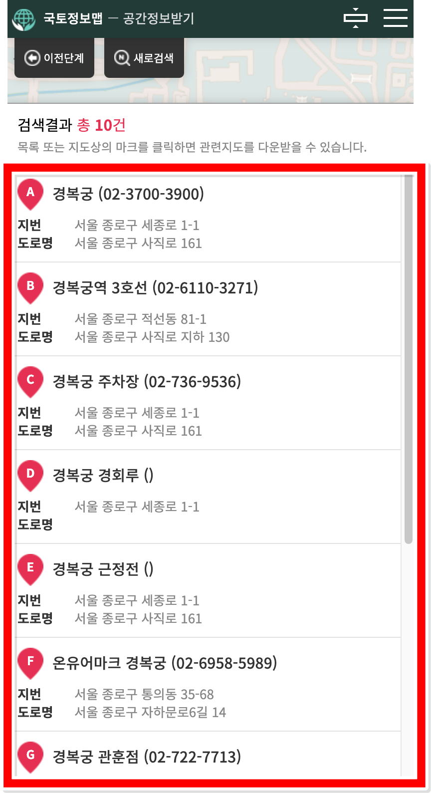 5. 검색된 장소들의 리스트가 상세 주소와 함께 한눈에 보여서 위치나 시설을 쉽게 파악할 수 있어요.