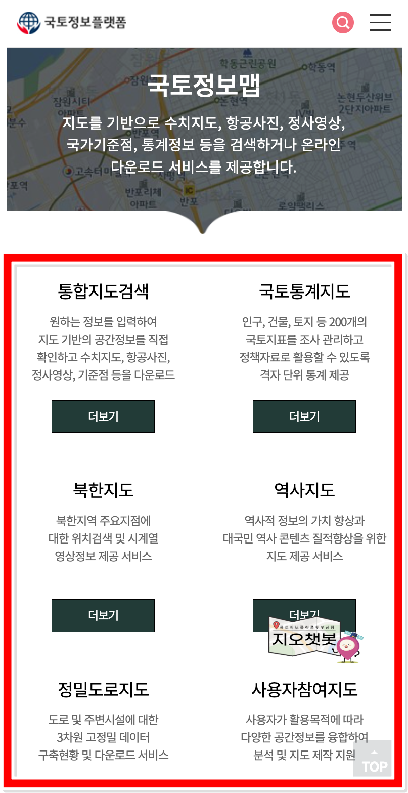 3. 지도 기반으로 통합검색, 통계지도, 북한지역 지도, 정밀도로, 사용자참여형 지도 등 다양한 주제별 지도가 마련되어 있어 원하는 정보를 직접 확인할 수 있어요.