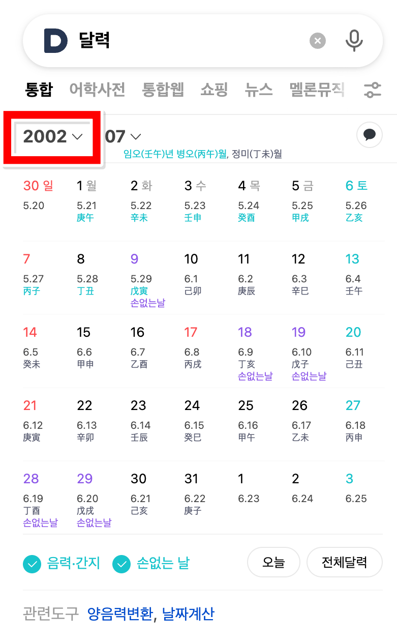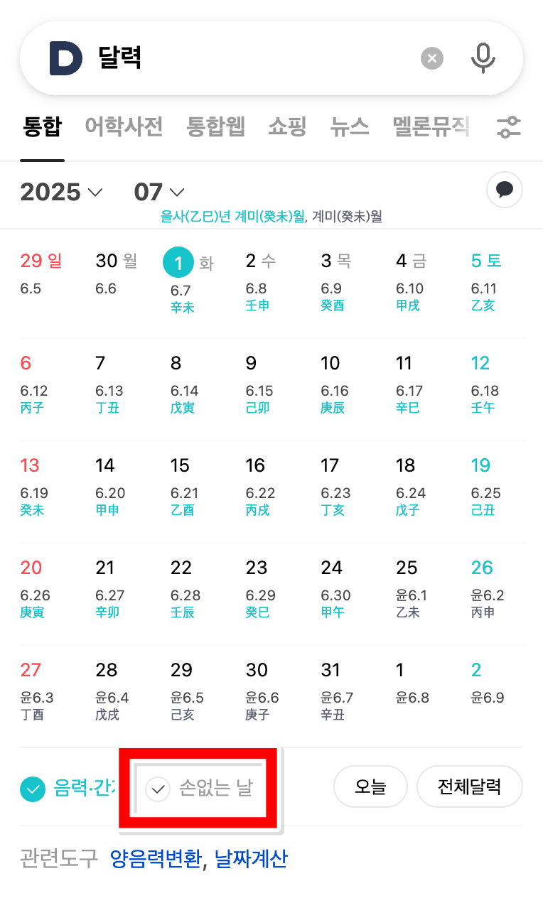2. 평범했던 달력에 음력날짜와 간지가 표시되어 만세력으로 변화한 것이 보이시죠? 이사, 개업, 택일 등 길일 선택 시 도움될 수 있는 손없는 날 알아보는 방법도 알려드릴게요. 아까 음력간지 메뉴 옆에 손없는 날 메뉴를 눌러 체크해주세요.