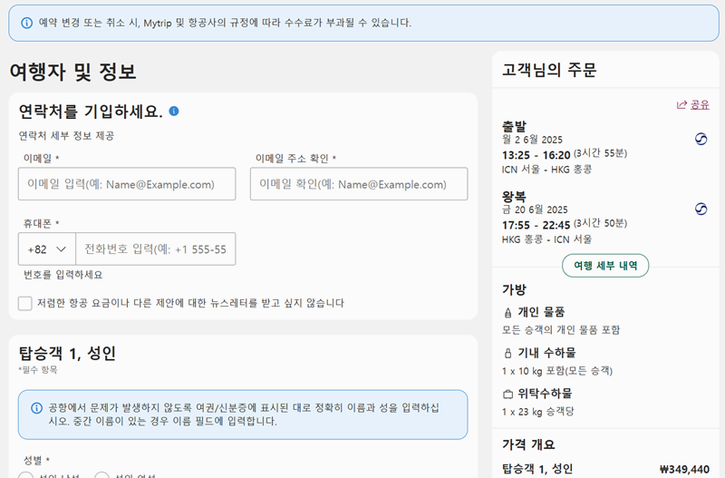7. 마지막 단계로, 탑승객 정보를 기입하는 화면이 나옵니다. 연락받을 이메일, 휴대폰 번호와 여권에 적힌 영문 이름 등을 정확하게 입력하면 모든 예약 과정이 마무리됩니다.