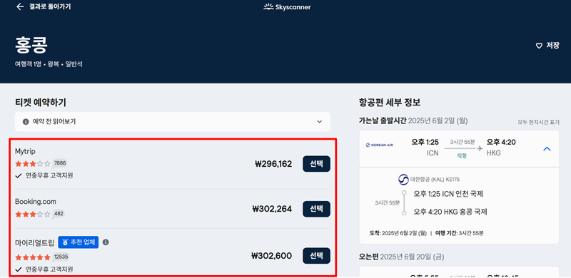 4. 마음에 드는 항공편을 고르면, 동일한 표를 판매하는 여러 여행 상품 판매처의 목록과 가격이 나타납니다. 각 판매처의 후기 등을 참고하여 가장 신뢰가 가는 곳으로 정하면 됩니다.