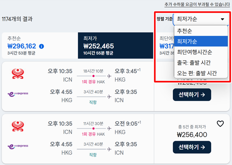 3. 더 저렴한 항공권을 찾고 싶다면 정렬 기준을 '최저가'로 바꿔보세요. 가장 낮은 가격의 항공편부터 순서대로 볼 수 있어 예산에 맞는 표를 고르기가 한결 수월해집니다.