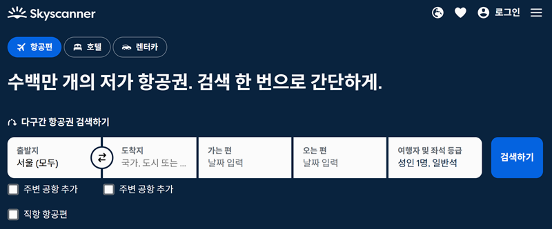 전 세계 수많은 항공사와 여행 상품 판매처의 항공권 가격을 한곳에 모아 보여주어, 사용자가 가장 합리적인 선택을 할 수 있도록 돕는 서비스예요. 스카이스캐너 항공권 예약은 스카이스캐너 홈페이지에서 이용 가능 합니다.