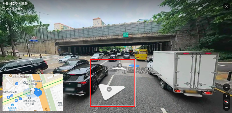 3. 도로 위에 파란색 선이 나타나면, 이 선들 중에서 내가 보고 싶은 위치를 정해 짚어줍니다.