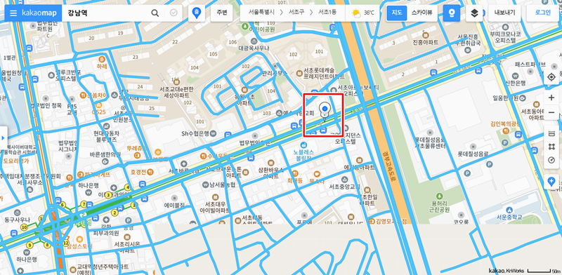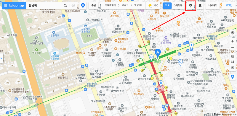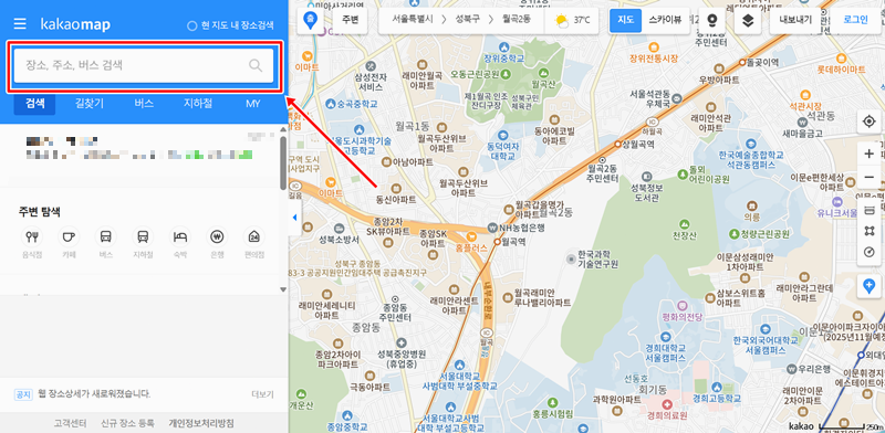 1. 화면 왼쪽 위에 있는 검색창에 찾아보고 싶은 곳의 이름이나 주소를 넣고 검색을 시작합니다.