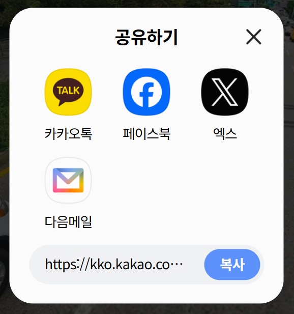 7. 현재 보고 있는 이 장소의 모습을 다른 사람에게 보여주고 싶다면 공유하기 기능을 이용하면 됩니다.자주 사용하는 메신저나 SNS로 바로 보내거나, 주소를 복사해서 원하는 곳에 붙여넣을 수도 있습니다.