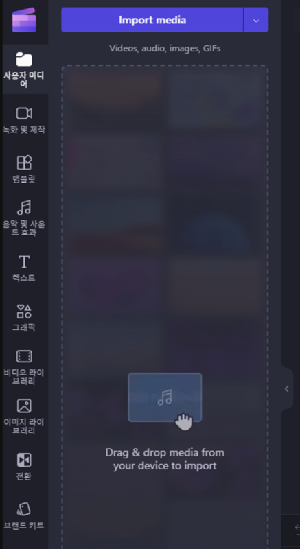 5. 이제 편집할 영상이나 사진, 음악 파일을 컴퓨터에서 찾아 작업 공간으로 가져옵니다. 파일을 마우스로 끌어다 놓는 방식으로도 간단하게 추가할 수 있습니다.