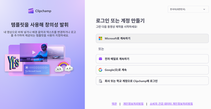 2. 편집을 시작하기 전에, 마이크로소프트나 구글, 또는 이메일 계정 중에서 편한 방법으로 로그인하거나 계정을 만듭니다.
