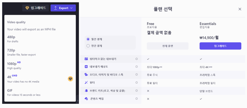 6. 편집을 마친 후 영상을 내보낼 때, 원하는 화질을 정할 수 있습니다. 무료 버전에서도 고화질로 저장이 가능하며, 더 높은 사양이 필요할 경우 유료 플랜을 살펴볼 수 있습니다.