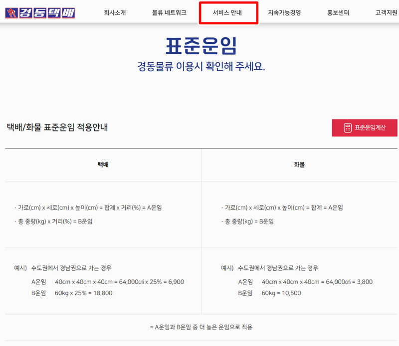 6. 택배를 보내기 전 예상 비용이 궁금하다면 상단 메뉴의 '서비스 안내'로 이동합니다. 이곳에서는 경동택배의 표준 운임에 대한 자세한 정보를 확인할 수 있습니다. 택배와 화물의 요금이 어떻게 계산되는지 기준을 살펴볼 수 있습니다.