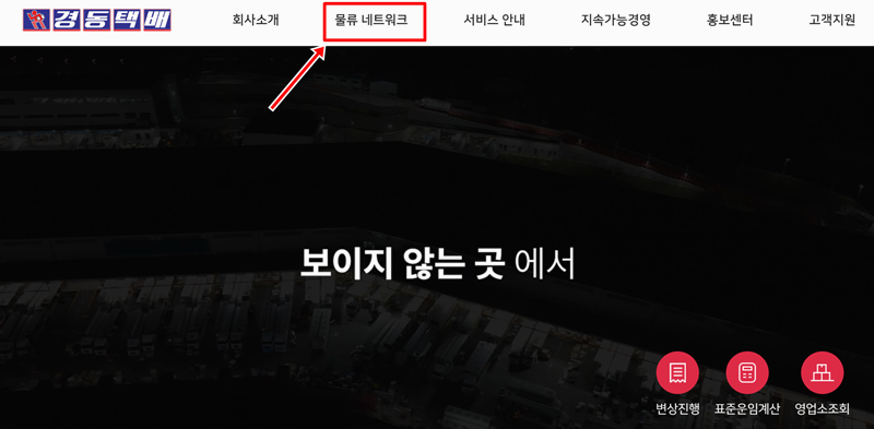 1. 홈페이지 상단 메뉴에 여러 항목이 있습니다. 이 중에서 전국의 영업소나 터미널 위치를 확인하기 위해서는 '물류 네트워크' 부분을 선택하여 다음 단계로 넘어갑니다.