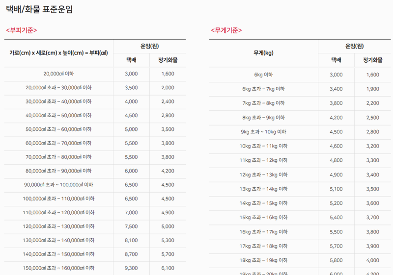 8. 최종 운임은 보내는 물건의 부피(가로x세로x높이)와 무게(kg)를 기준으로 결정됩니다. 이 운임표를 보면 내 물건의 크기와 무게가 어느 구간에 해당하는지, 그리고 그에 따른 택배와 정기화물 요금이 얼마인지 상세하게 알 수 있습니다.
