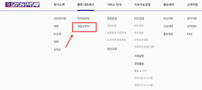 2. '물류 네트워크'를 선택하면 아래로 새로운 메뉴가 나타납니다. 회사 소개, 터미널 위치 등 다양한 정보 중에서 내가 있는 곳과 가장 가까운 지점을 찾기 위해 '영업소위치' 항목을 골라주면 됩니다.
