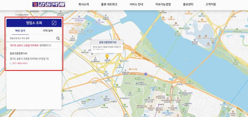 3. 영업소 조회 화면으로 이동하면 '빠른 검색'이 기본으로 설정되어 있습니다. 여기에 찾고 싶은 지점의 이름이나 주소를 직접 입력하여 검색할 수 있습니다. 예시처럼 '경기도 김포시 고촌읍'을 검색하면 해당 지역의 지점 정보가 나타납니다.