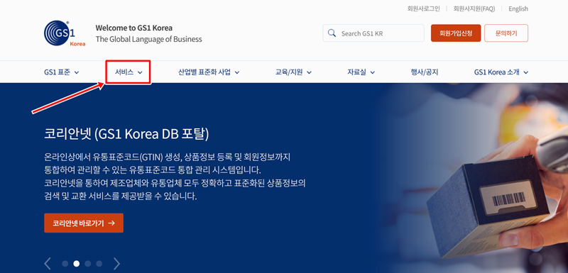 1. 홈페이지 상단 메뉴에서 '서비스' 항목을 찾아 누르면, 관련 하위 메뉴들을 확인할 수 있습니다. 유통표준코드 조회부터 바코드 생성, 교육 지원까지 다양한 업무를 이곳에서 처리할 수 있으니 참고해 주세요.